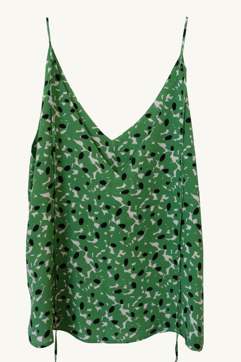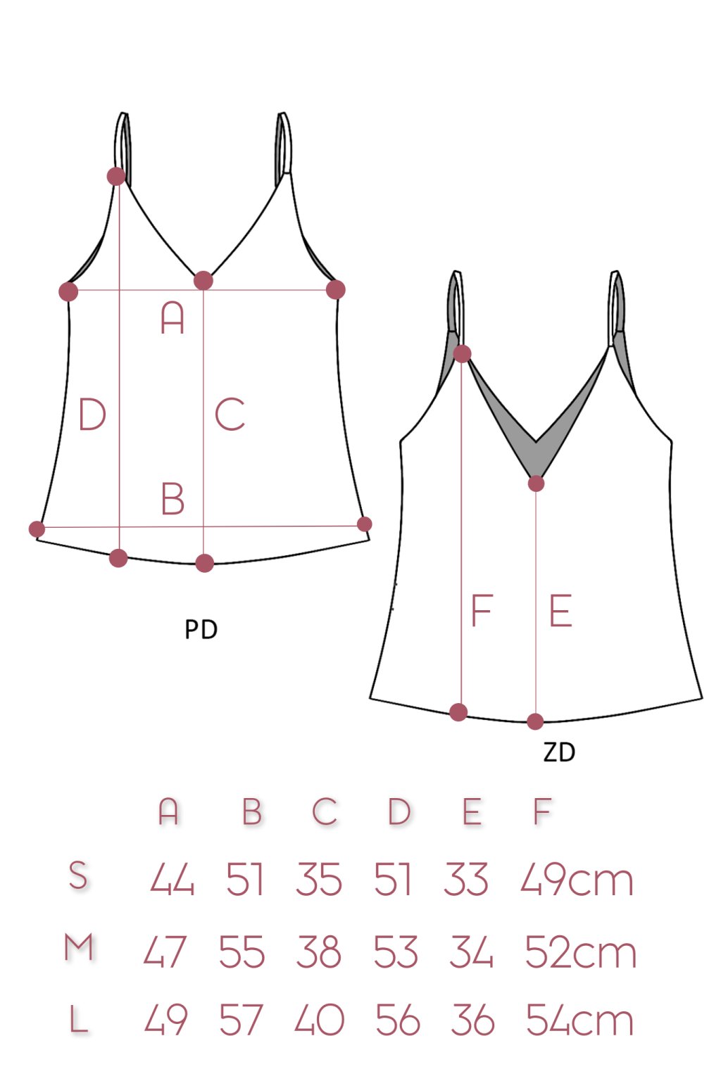 Letný top s výstrohom do V v prednej aj zadnej časti. Výstrih na chrbte je hlbší ako ten predný. V hornej časti je top dvojvrstvový. Ramienka sa prevliekanú do slučky v zadnej časti a tým sa dá regulovať hĺbka výstrihu.